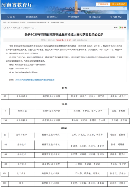 1月14日,省教育厅公布了《关于2025年河南省高等职业教育技能大赛拟获奖名单的公示》,食品与化工学院9支参赛队伍在食品与粮食、现代农业、轻工等6个赛道中奋勇争先,斩获1金2银6铜佳绩,获奖覆盖领域、数量与质量均实现历史性突破,充分展现了学院在专业教学改革、实践技能培养与复合型人才锻造方面的扎实成效。