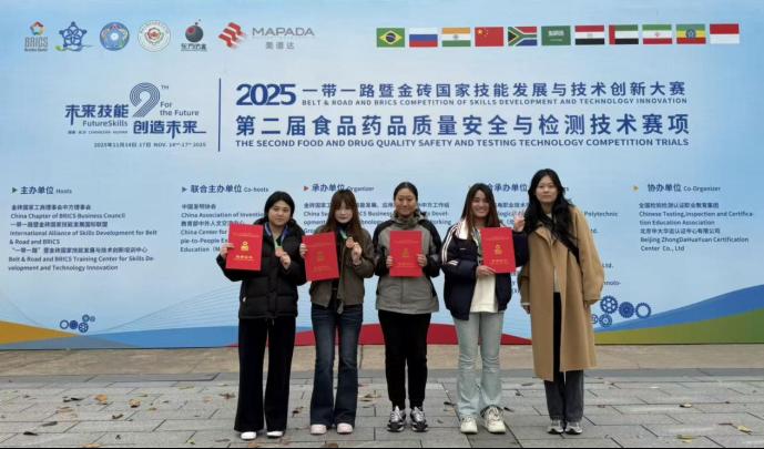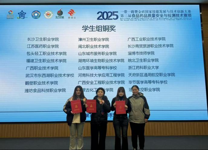 11月17日,2025年“一带一路”暨金砖国家技能发展与技术创新大赛第二届食品药品质量安全与检测技术赛项全国总决赛在湖南生物机电职业技术学院成功举办。经过全国选拔,80支精英学生组队伍齐聚决赛舞台。我校食品与化工学院代表队凭借过硬的专业素养和出色发挥,勇夺学生组全国总决赛铜牌,充分彰显了我校在食品药品质量安全与检测技术领域的教学实力与学子风采。