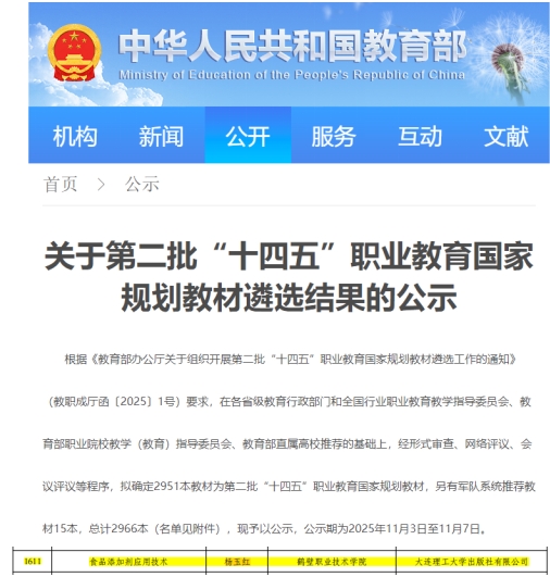 近日,教育部发布了《关于第二批“十四五”职业教育国家规划教材遴选结果的公示》,由食品与化工学院杨玉红教授主编的《食品添加剂应用技术》成功入选。该成果是我院深入贯彻落实国家教育强国战略、服务现代化产业体系建设的重要体现,标志着学院在高水平教学资源建设面取得又一新的突破。